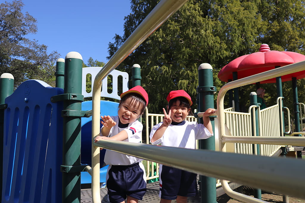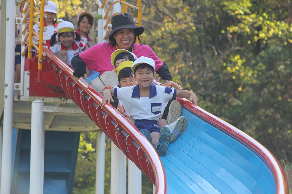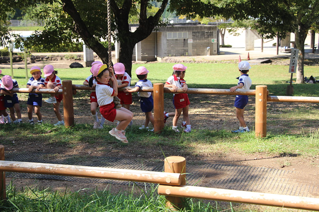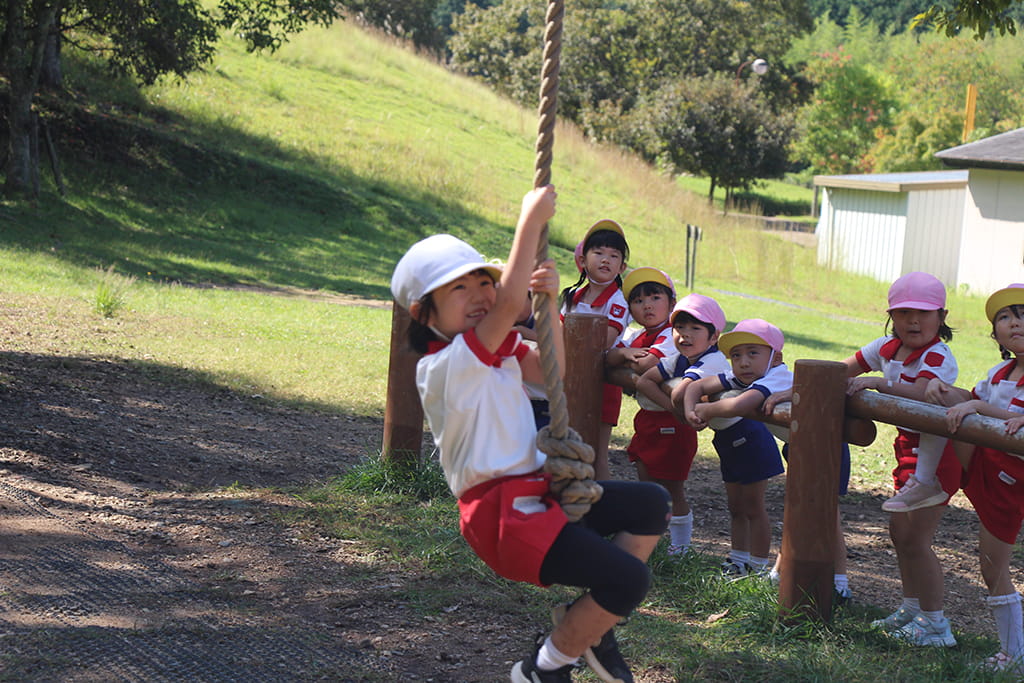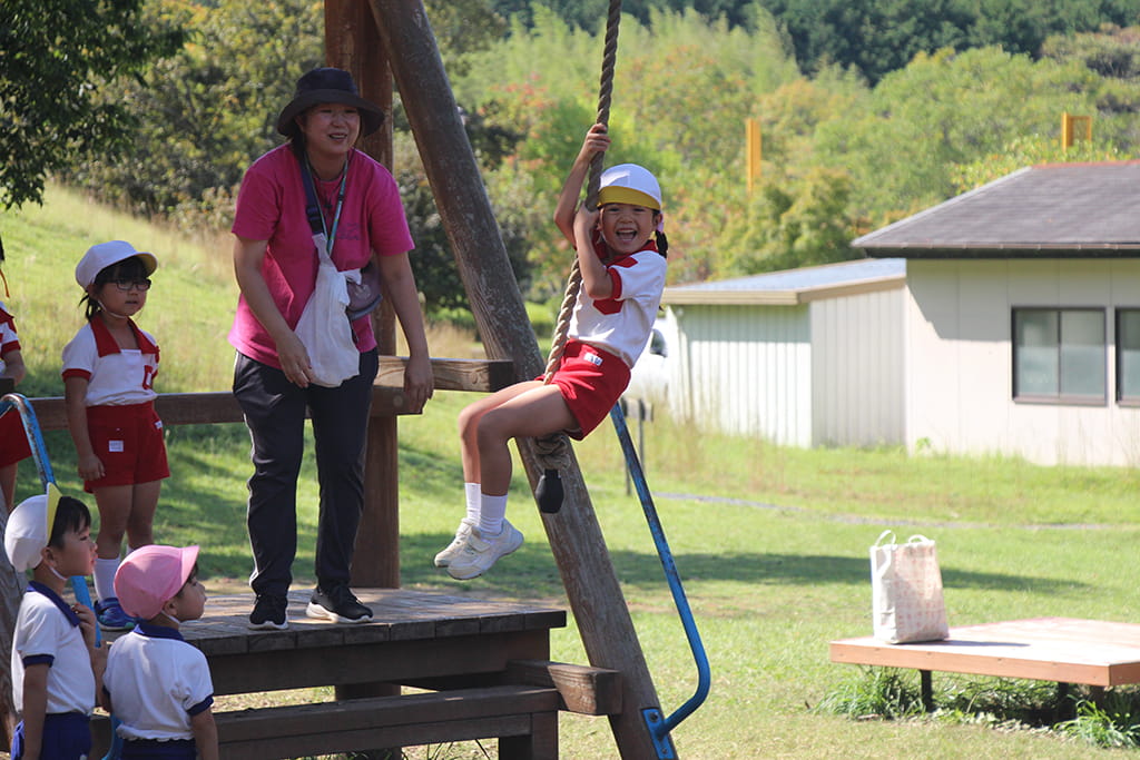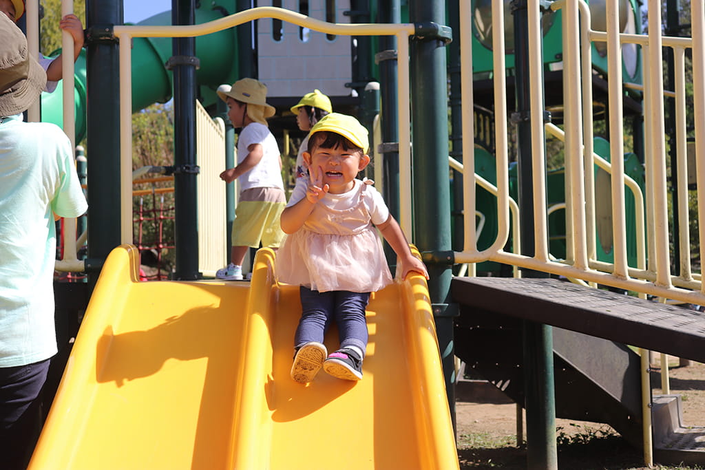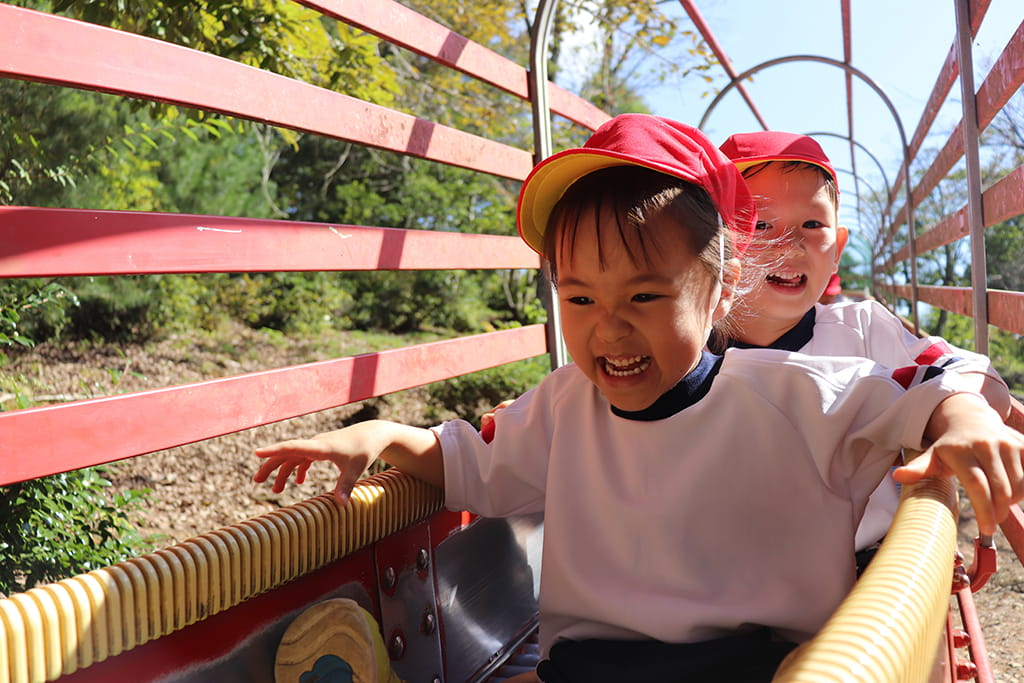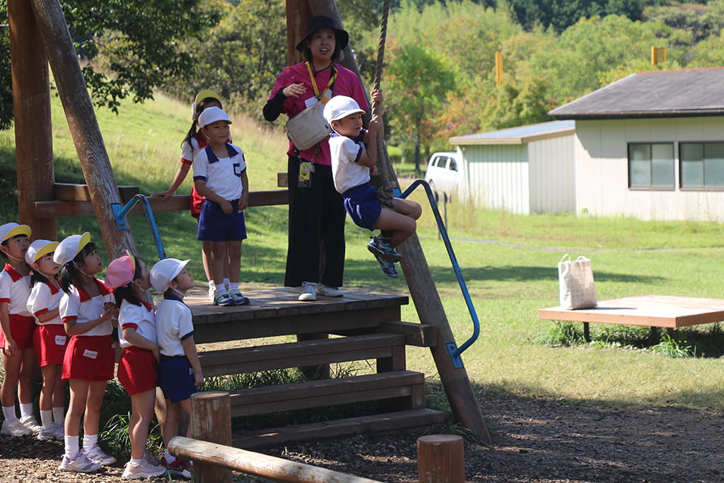 今年も全園児で“丹波自然運動公園”へ遠足に出かけました。豊かな緑と澄んだ空気に包まれ、子どもたちはアスレチックやターザンロープ、大きなすべり台で元気いっぱいに遊びました。広い芝生の上を走り回る姿はまるで小さな探検隊のようで、自然の恵みを全身で感じていました。