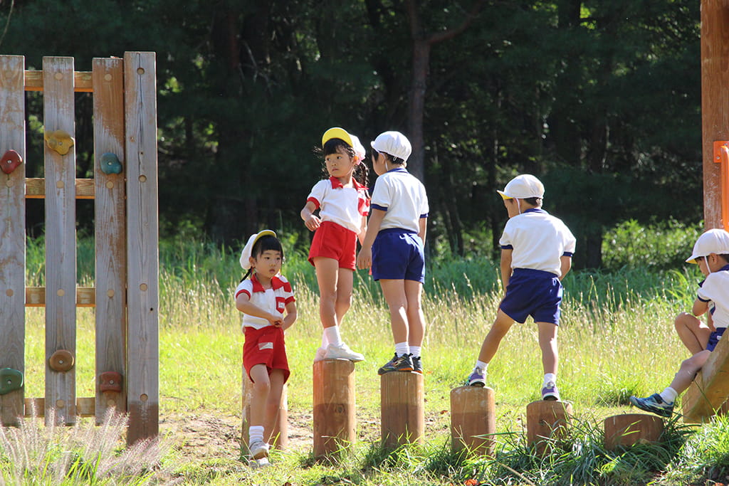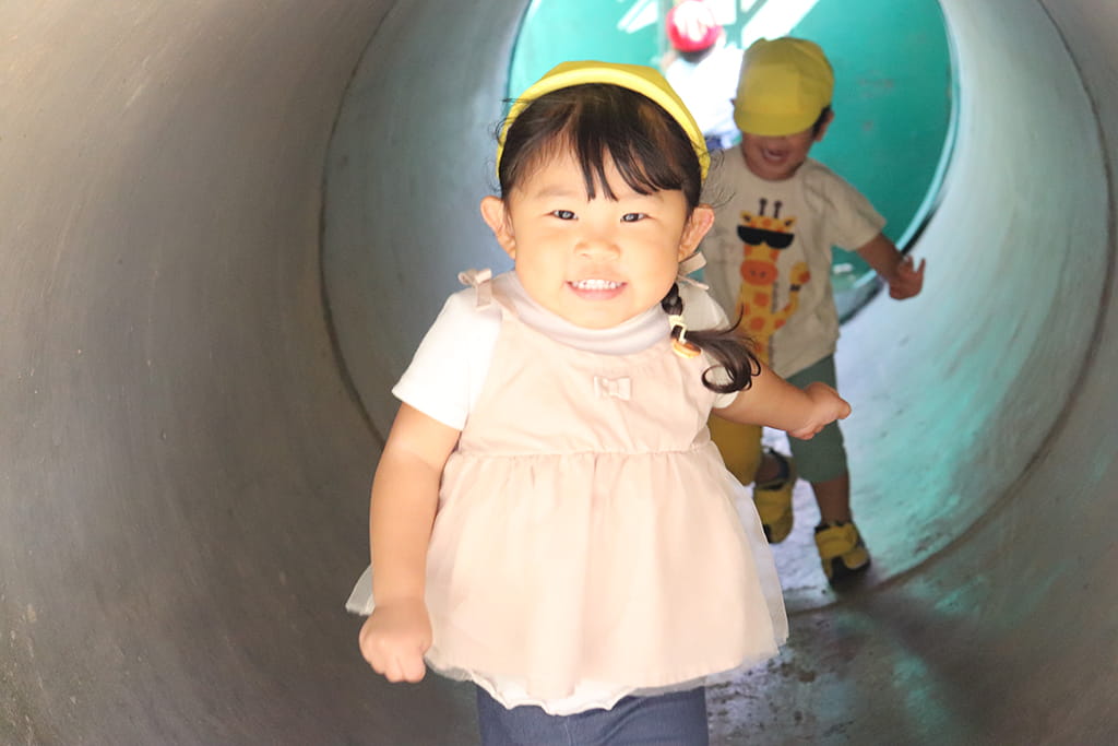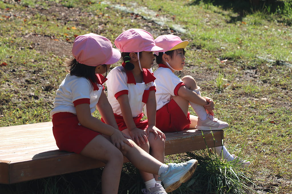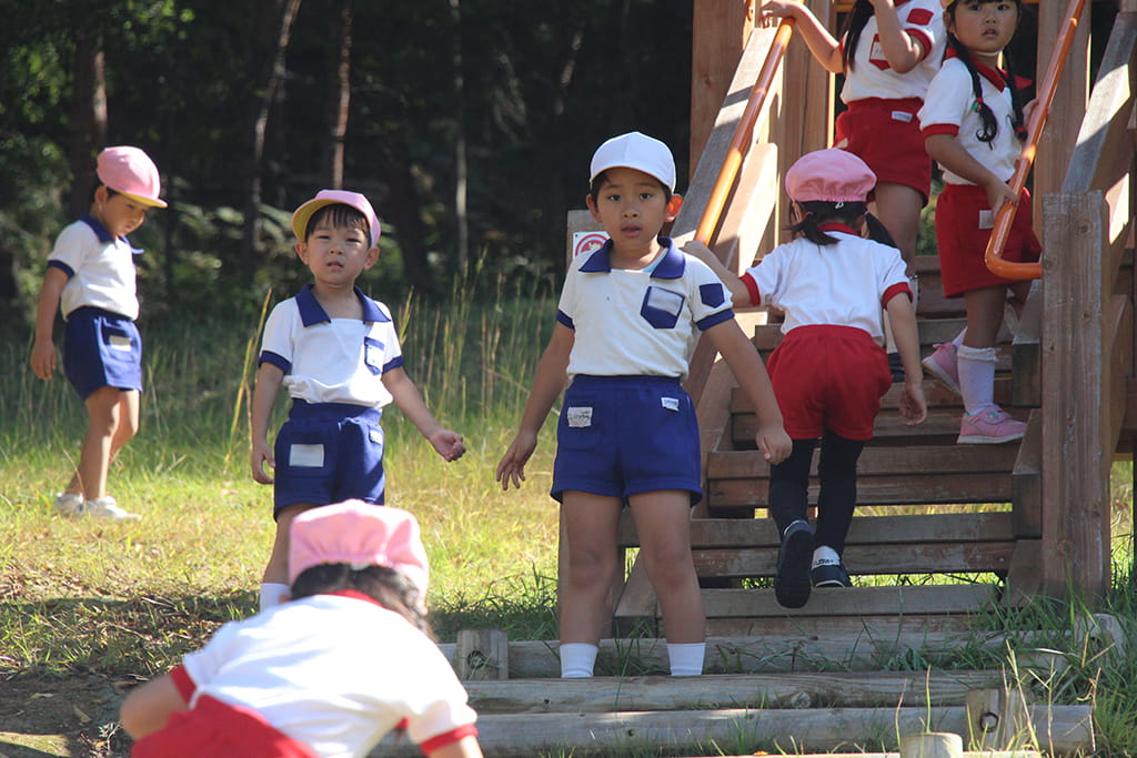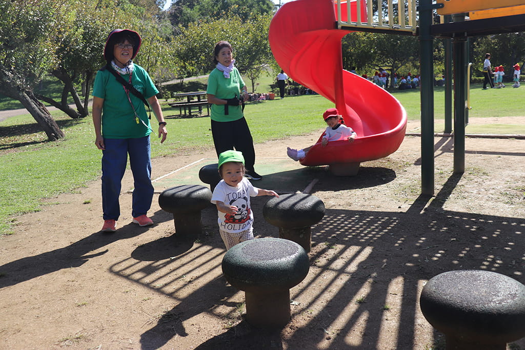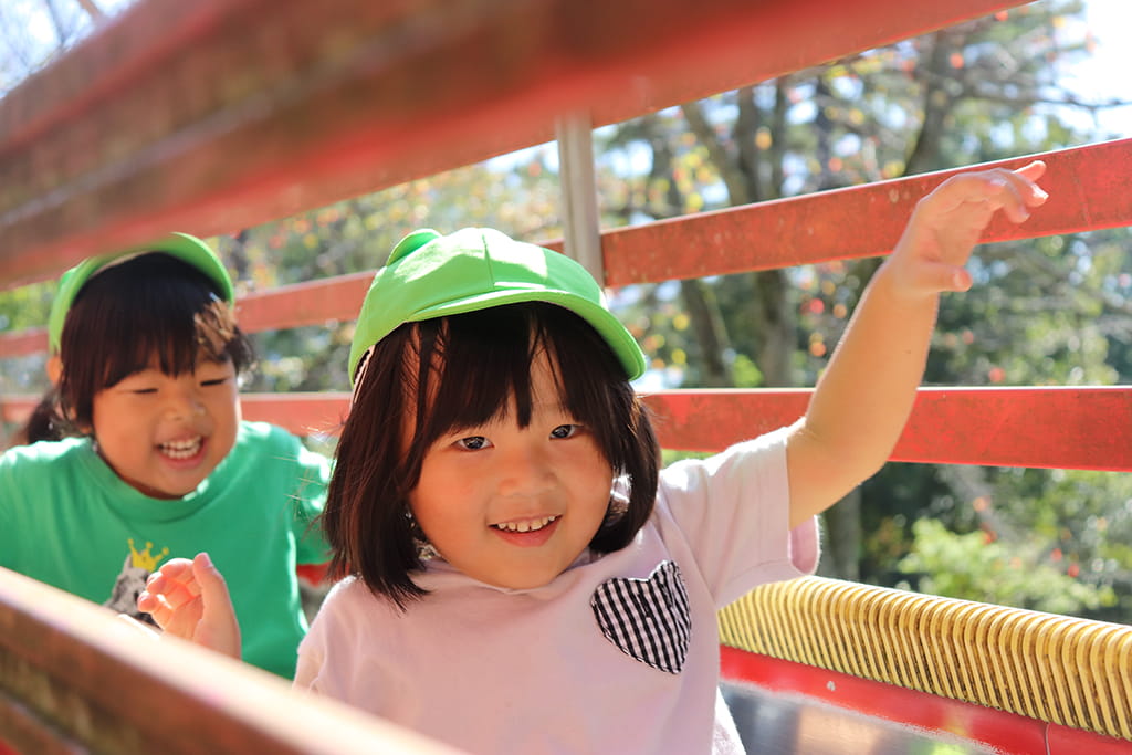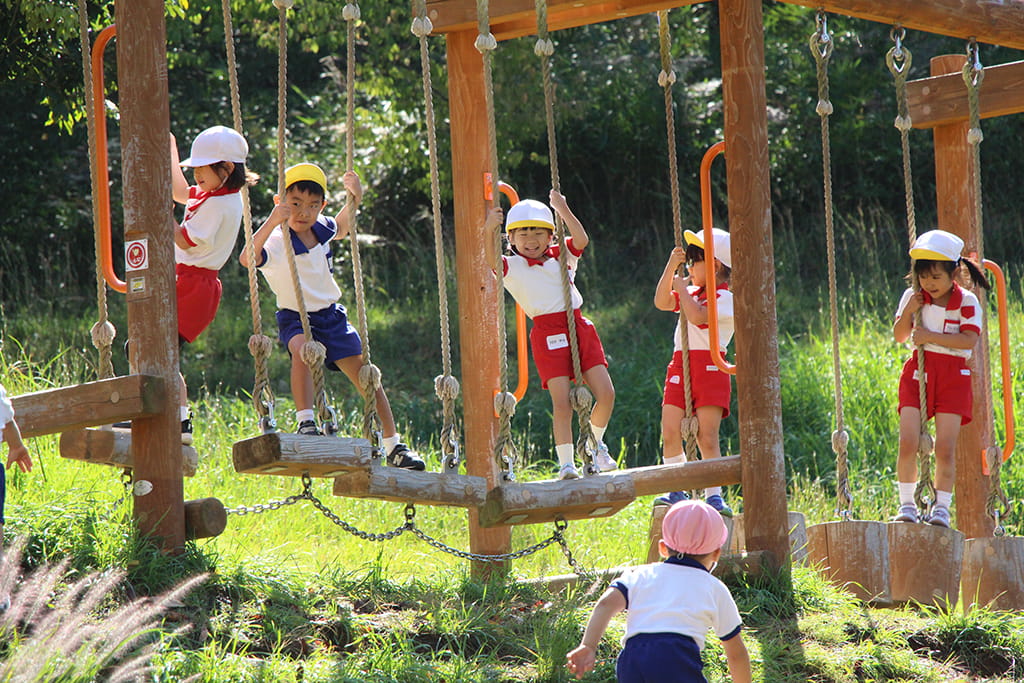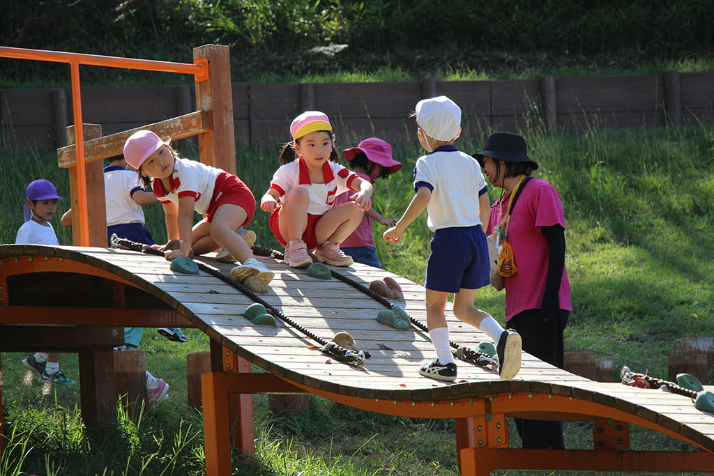 今年も全園児で“丹波自然運動公園”へ遠足に出かけました。豊かな緑と澄んだ空気に包まれ、子どもたちはアスレチックやターザンロープ、大きなすべり台で元気いっぱいに遊びました。広い芝生の上を走り回る姿はまるで小さな探検隊のようで、自然の恵みを全身で感じていました。